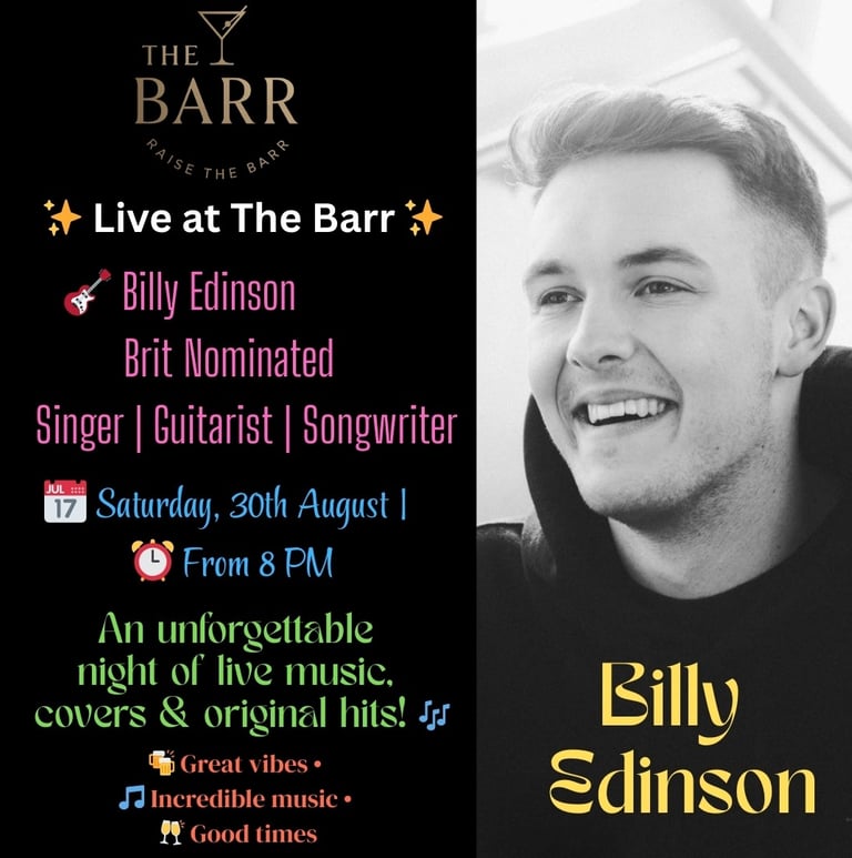 Get ready, Bacup! 🎉 On Saturday, 30th August, we welcome the sensational Billy Edinson to The Barr! 🎸🎤